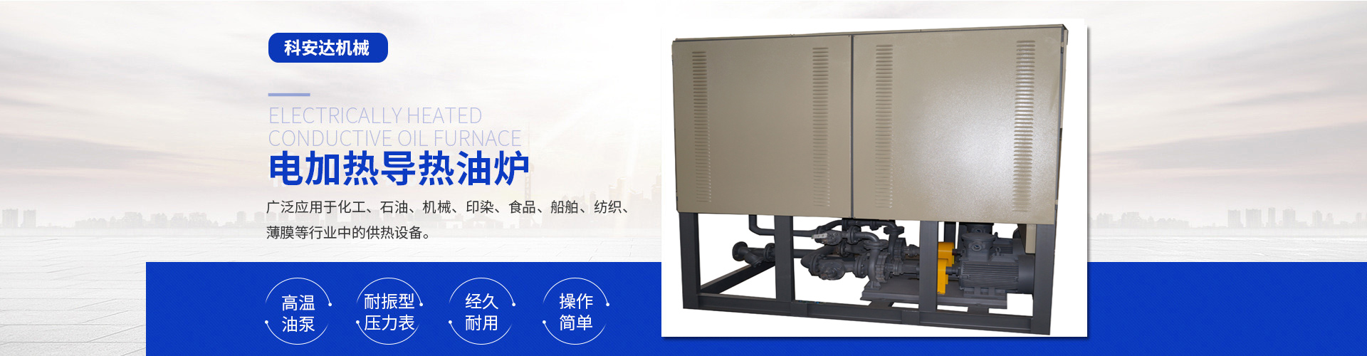 近年來我公司在延用自己的技術基礎上不斷引進先進技術與管理經驗,專業研發(fā)制造電加熱導熱油爐(有機熱載體爐)、電磁感應加熱器、電加熱爐、熱風循環(huán)箱式預熱爐、風道加熱器、空氣加熱罐、電加熱管、高溫電阻爐、保溫烘箱、烘道、鑄鋁鑄銅加熱器、防爆加熱器、遠紅外加熱管、埋入式遠紅外陶瓷加熱瓦、陶瓷加熱圈、不銹鋼云母電熱圈、碳化硅遠紅外電加熱板、電熱帶 、真空清洗爐、三甘醇清洗爐等。產品適用于化纖、紡織、皮革、塑料機械、電纜機械、食品機械、橡膠機械、冶金、石油、化工、電子、醫療、海洋工程、家用電器等行業。同時可根據客戶使用與現場安裝的需要,設計、制造特殊規(guī)格的上述設備,企業以其先進技術、合理的價格,周道的服務使產品遠銷國內外。
